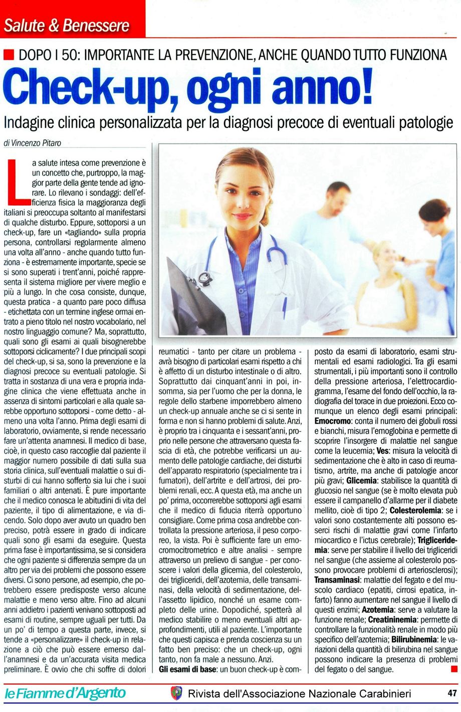 Salute, l'importanza del check-up Proponiamo ai nostri lettori un interessante articolo di Salute & Benessere (Check-up, ogni anno!) pubblicato dal giornalista e scrittore Vincenzo Pitaro sul mensile dell'Associazione Nazionale Carabinieri, «Le Fiamme d'Argento».