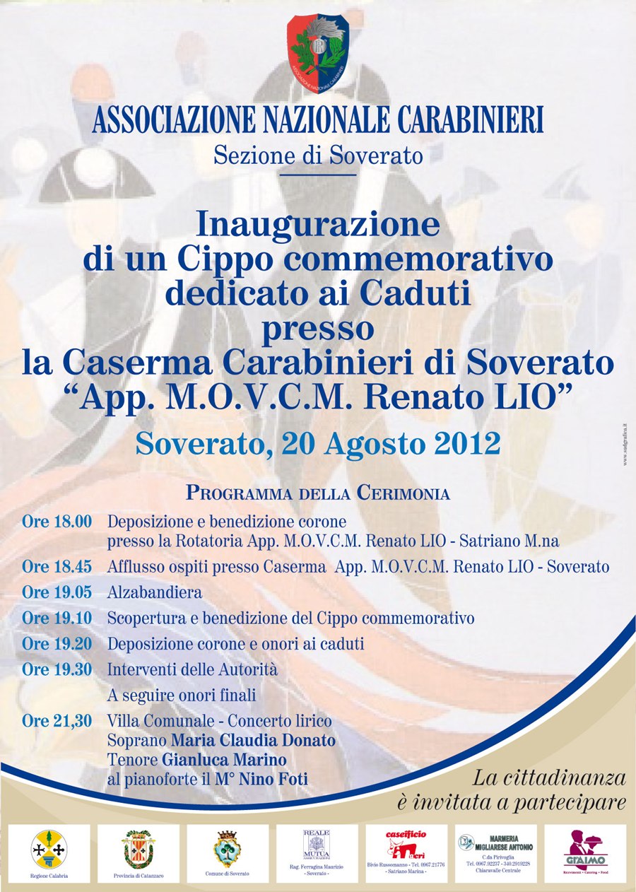 NEL GIORNO DELLA RICORRENZA DEL 21° ANNIVERSARIO DELL’UCCISIONE DELL’APP. M.O.V.C.M. RENATO LIO, CADUTO IN LOCALITA’ RUSSOMANNO DI SATRIANO PER MANO DI PLURIPREGIUDICATO, NEL CORSO DI SERVIZIO PERLUSTRATIVO, SARA’ INAUGURATO UN CIPPO ALLA MEMORIA DEI CADUTI DELL’ARMA, ALLA PRESENZA DI AUTORITA’ CIVILI, MILITARI E religiose OLTRE CHE RAPPRESENTANZE D’ARMA. L’INIZIATIVA, VOLUTA DALL’ASSOCIAZIONE NAZIONALE CARABINIERI – SEZIONE DI SOVERATO – presieduta dal s.ten. giovanni branca - E’ STATA PORTATA AVANTI DI CONCERTO CON LA COMPAGNIA CARABINIERI DI SOVERATO. LA CERIMONIA AVRA’ INIZIO ALLE ORE 18.45 DEL 20/08/2012 NEL CORTILE DELLA CASERMA CARABINIERI DI SOVERATO. LA CITTADINANZA E’ INVITATA A PARTECIPARE ALLE ORE 21.30 SEGUIRA’ CONCERTO LIRICO ALLA VILLA COMUNALE |