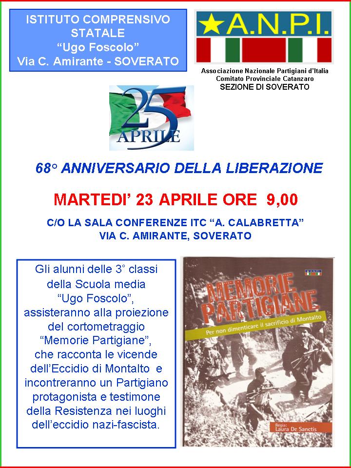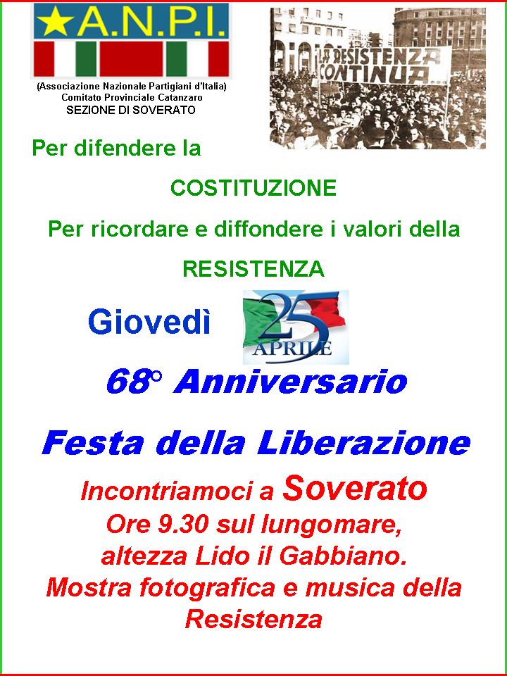Il Comitato Provinciale ANPI di Catanzaro presenta il programma di iniziative per la Festa della Liberazione 2013 Sabato 20 Aprile - ore 18,00 Libreria Ubik - Catanzaro Presentazione del libro “Io sono l’ultimo” con Andrea Liparoto e Silvio Messinetti del quotidiano “il Manifesto” *** Martedì 23 Aprile - ore 9,00 Istituto Comprensivo Ugo Foscolo - Soverato "Memorie Partigiane" *** Mercoledì 24 Aprile - ore 17,30 Piazza Matteotti - Catanzaro Passeggiata della Memoria sulle Vie dei Partigiani organizzata con UISP *** Giovedì 25 Aprile dalle ore 9,00 in poi in Piazza A.Garibaldi - Catanzaro Lido Manifestazione in Piazza Immagini, documenti, fotografie, musica della Resistenza e della lotta di Liberazione *** Giovedì 25 Aprile TROFEO DELLA LIBERAZIONE Campo Scuola di Catanzaro dalle 8.45 Organizzato da UISP in collaborazione con ANPI *** Giovedì 25 Aprile - ore 9,30 Manifestazione sul Lungomare di Soverato *** Giovedì 25 Aprile - ore 16.00 Scuola Elementare Cropani Marina Mostra sulla Resistenza ed inaugurazione sezione intercomunale dell’ANPI *** Venerdì 26 Aprile - ore 10 Sala convegni Scuola Media Rodari Commemorazione dei fratelli Cervi Con i comuni di Soveria Mannelli, Carlopoli e dell’Istituto Comprensivo Rodari